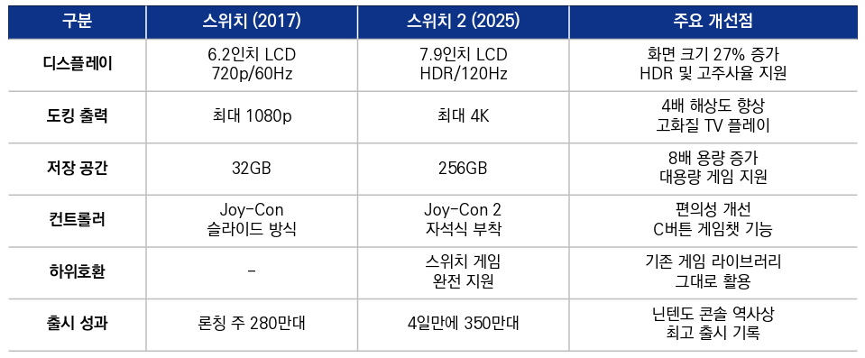 <표> 닌텐도 스위치 2 주요 개선 사항 및 특징