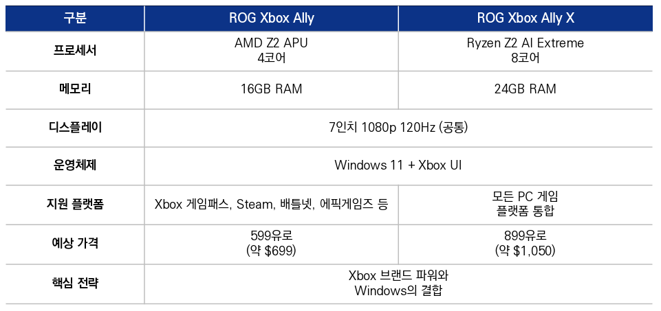 <표> Xbox Ally 시리즈 하드웨어 스펙 비교