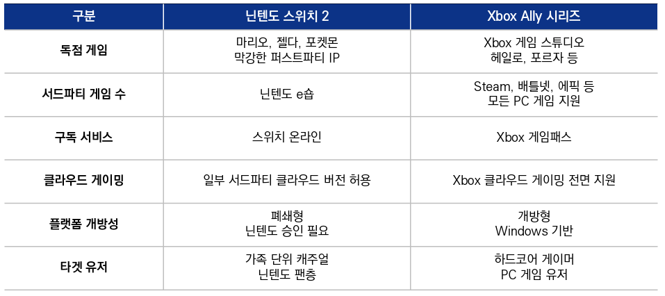 클라우드 및 온라인 서비스 경쟁도 중요한 관전 포인트다. 마이크로소프트는 이미 Xbox 클라우드 게이밍(xCloud) 서비스를 전세계적으로 전개하며, Ally 같은 휴대용 기기와의 시너지를 추구하고 있다. 네트워크만 원활하다면 고사양 게임을 기기 성능과 관계없이 스트리밍 플레이할 수 있고, 기기에서 저장한 게임 상태를 콘솔이나 PC에서 이어할 수도 있다. 한국처럼 5G 인프라가 잘 구축된 시장에서는 이러한 클라우드 플레이가 현실적인 사용 사례가 될 수 있다. 반면 닌텐도는 자체 클라우드 서비스가 미흡하여, 일부 서드파티 게임에 한정된 클라우드 버전을 허용하는 수준에 그친다. 또한 마이크로소프트는 Xbox Game Pass를 통해 월 구독료만으로 수백 종의 게임을 제공하는 구독형 모델을 주도하고 있는데, 스위치 진영의 온라인 서비스는 주로 레트로 게임 제공과 온라인 멀티플레이 지원에 집중되어 둘 사이 비즈니스 모델에도 차이가 크다.