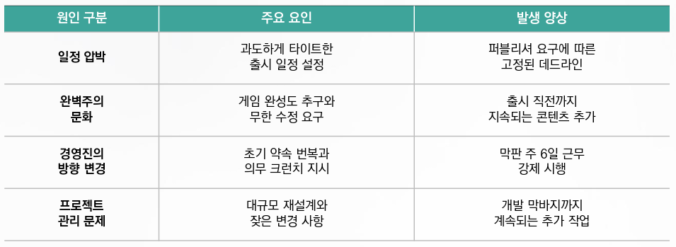 퍼블리셔 요구와 리더십 완벽주의가 맞물린 크런치 악순환 구조 형성