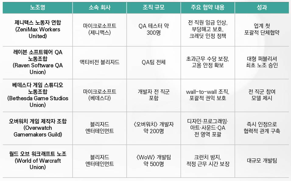 액티비전 블리자드(Activision Blizzard) 산하 스튜디오들에서도 노조 조직화가 연쇄적으로 진행되고 있다. 2022년 액티비전 블리자드의 Raven Software QA팀이 미국 대형 퍼블리셔로서는 최초로 노조 승인을 받은 데 이어, 2024년에는 베데스다 게임 스튜디오(Bethesda Game Studios) 직원들이 개발자 전 직군을 포함한 월투월(wall-to-wall) 노조를 결성했다. 블리자드의 <월드 오브 워크래프트> 개발팀 약 500명이 노조화에 동참했고, 2025년 초에는 <오버워치> 개발자 약 200명이 참여하는 노조인 Overwatch Gamemakers Guild가 새로 출범했다. 해당 오버워치 노조는 디자인, 프로그래밍, 아트, 사운드, QA 등 모든 직군을 포괄하는 형태로 조직되었으며, 다수 직원의 동의를 얻어 마이크로소프트가 이를 즉시 인정했다. <오버워치> 노조의 조직위원인 한 선임 테스터는 “업계에 오랫동안 만연해 온 잦은 해고, 크런치, 열악한 근무환경에 지쳐 있던 동료들과 함께 목소리를 내게 되어 기쁘다”면서, “단결하여 근무환경을 개선하는 노력은 게임산업 전체를 더 나은 방향으로 이끌 것”이라고 밝혔다.