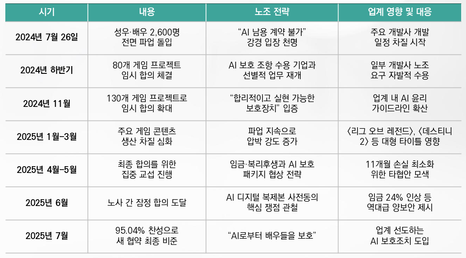 노사 교섭이 교착상태에 빠진 가운데 2024년 7월 26일 SAG-AFTRA는 액티비전, EA, 에픽게임즈, 워너브라더스 등 주요 게임회사들을 대상으로 성우·배우 2,600여 명이 참여하는 전면 파업에 돌입했다. 파업의 핵심 쟁점은 AI를 이용한 무단 성우·배우 대체 문제였으며, 노조는 “회사가 AI를 남용하도록 내버려 두는 계약은 결코 받아들일 수 없다”는 강경한 입장을 고수했다. 11개월간 지속된 파업 기간 동안 게임업계는 상당한 개발 차질을 겪었고, 이는 결국 양측이 새로운 합의점을 찾도록 압박하는 요인이 되었다. 2025년 6월 마침내 잠정 합의에 도달하면서 파업은 종료 단계에 들어섰고, 같은 해 7월 초 조합원 투표를 통해 95.04%의 압도적 찬성으로 새 협약이 비준되면서 파업은 공식 종료되었다.