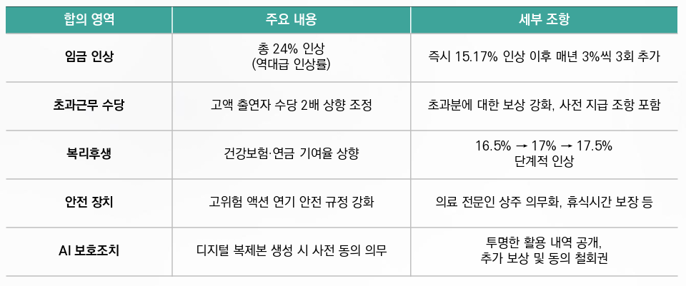 2025년 7월 95.04% 찬성으로 새 협약 비준, 임금 24% 인상 및 AI 보호조치 도입