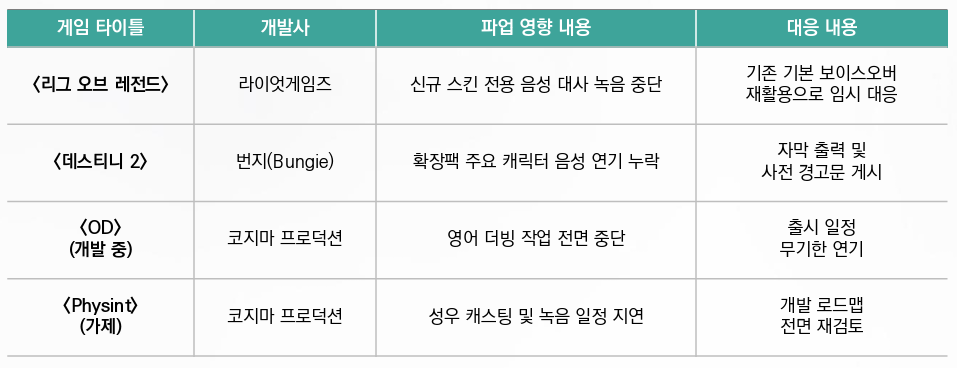 11개월간 지속된 SAG-AFTRA 파업은 게임 콘텐츠 생산 일정에 광범위한 차질을 야기했다. 성우와 모션캡처 배우들의 공백으로 인해 여러 인기 게임들이 신규 콘텐츠 제공에 어려움을 겪었으며, 일부 타이틀은 출시 일정 자체를 조정해야 하는 상황에 직면했다. 라이엇게임즈는 2024년 말 성명을 통해 파업 지속으로 인해 <리그 오브 레전드> 신규 스킨들에 전용 음성 대사 녹음 작업을 중단하고, 임시로 기존 기본 보이스오버를 재활용하여 서비스한다고 발표했다. 이는 세계적 인기 게임이 새로운 콘텐츠 제공에 차질을 빚은 대표 사례로, 파업 여파가 게임 이용자 경험에도 직접 영향을 준 것이다. 또한 번지(Bungie)는 예정된 <데스티니 2> 확장팩 “Episode: Heresy”에서 일부 캐릭터의 신규 음성 연기가 누락될 것이라고 공지했다.