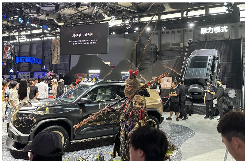 <검은 신화: 오공>의 영향력은 게임 영역을 넘어 다른 산업과의 융합으로 확산되고 있다. 전기차 기업 BYD는 <검은 신화: 오공>과 콜라보한 스페셜 에디션 차량을 차이나조이에 출품해 게임 IP와 자동차 디자인 융합이라는 신선한 시도를 선보였다. 검정 차체에 금색 문양으로 손오공을 형상화한 이 차량은 부스에서 손오공 분장을 한 코스플레이어들과 함께 포토타임을 진행해 관람객들의 발길을 멈추게 했다. 이러한 크로스오버 마케팅은 중국 전통 IP가 단순한 게임 콘텐츠를 넘어 문화 전반으로 확산되는 상징적 사례로 평가받고 있다.