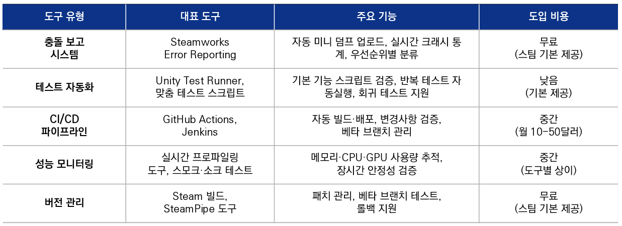 개별 인디게임 개발팀이 모든 품질 관리 도구와 노하우를 독립적으로 구축하기는 현실적으로 어렵다. 따라서 지원 기관과 스팀, 구글플레이 등 플랫폼 차원에서 공동 QA 인프라를 구축하는 것이 효과적이다. 공동 QA 도구 제공, 테스터 풀 공유, 정기적인 기술 교육 프로그램 운영을 통해 개별 개발팀의 부담을 줄이면서 전체 산업의 품질 수준을 향상시킬 수 있다. 특히 유니티 테스트 러너, 깃허브 액션 같은 자동화 도구 활용법이나 Steamworks Error Reporting 시스템 최적화 방법 등을 교육하는 프로그램을 정기적으로 운영하여 기술 격차를 해소해야 한다.