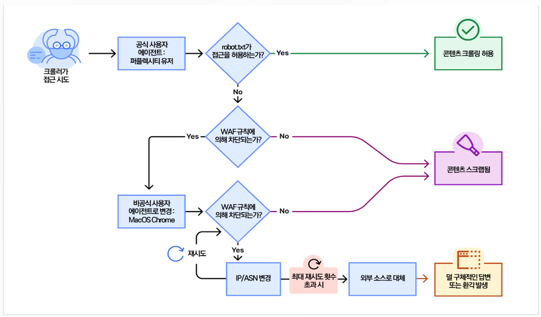 2025년 8월 클라우드플레어는 공식 블로그를 통해 AI 검색 스타트업 Perplexity의 크롤러5)가 웹사이트의 접근 제한을 우회하기 위해 사용자에이전트를 조작하고 IP 주소를 여러 네트워크로 순환시켜 신원을 숨기는 스텔스 크롤링 기법을 사용했다고 공개했다. 보고서에 따르면 Perplexity는 사이트가 자사 크롤러를 차단하면 공식 크롤러 이름인 “PerplexityBot” 대신 일반 Chrome 브라우저로 위장하고, IP 주소를 돌려가며 차단 목록을 피해 데이터를 수집했다. 하루 수백만 건의 요청을 수만 개 도메인에 보내는 동안 robots.txt6) 파일을 무시하거나 아예 요청하지 않는 사례도 다수 발견되었다. 이러한 행태는 웹 크롤링의 기본 원칙인 투명성, robots.txt 존중, 과도한 요청 회피 등을 정면으로 위반하는 것으로, 웹 생태계의 신뢰를 근본적으로 흔드는 문제로 지적받았다.