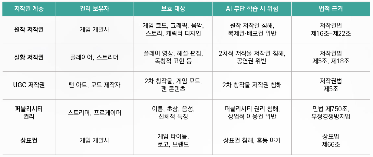 <표> 게임 콘텐츠 저작권 구조와 AI 학습 시 법적 위험