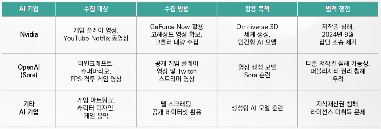 <표> AI 기업의 게임 데이터 무단 학습 사례