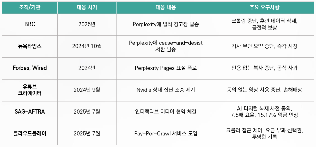 AI 봇의 무단 크롤링과 콘텐츠 표절은 주요 언론사와 콘텐츠 제작자들의 강력한 법적 대응을 촉발했다. 영국 공영방송 BBC는 지난 6월 Perplexity에게 크롤링 즉각 중단, 훈련 데이터에서 BBC 콘텐츠 삭제, 그리고 금전적 보상을 요구하는 법적 경고장을 발송했다. 미국의 뉴욕타임스 역시 2024년 10월 Perplexity에 중단 및 금지 서한을 보내 자사 기사를 무단으로 요약하고 사용한 점을 지적하며 즉각적인 시정을 요구했다. Forbes와 Wired는 Perplexity가 운영하는 ‘퍼플렉시티 페이지’라는 도구에서 자사의 보도 내용과 이미지를 인용 표시 없이 그대로 복사했다고 폭로했으며, Perplexity CEO는 “미흡한 부분(rough edges)이 있었다”고 인정하며 문제의 심각성을 시인했다. 이러한 일련의 사건들은 AI 기업의 데이터 수집과 활용이 저작권을 침해할 가능성이 매우 크며, 콘텐츠 제공자들이 더 이상 이를 묵인하지 않겠다는 의지를 보여주고 있다.