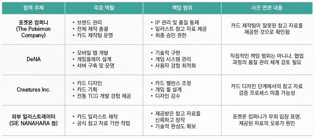 그러나 이번 사건은 포켓몬 TCG 포켓의 복잡한 개발 구조가 품질 관리의 사각지대를 만들 수 있다는 점을 드러냈다. 포켓몬 TCG 포켓은 포켓몬 컴퍼니, DeNA, Creatures Inc. 3개 회사가 협업하여 개발·운영하는 프로젝트다. 포켓몬 컴퍼니는 브랜드 관리와 전체 제작을 총괄하며 카드 제작팀을 운영하고, DeNA는 모바일 앱 개발과 게임플레이·서버 구축을 담당하며, Creatures Inc.는 전통적인 포켓몬 TCG 개발사로서 카드 디자인과 기획을 맡는다. 이처럼 여러 회사가 역할을 분담하는 구조에서는 참고 자료의 출처 검증, 최종 검수 책임 소재, 외주 아티스트와의 커뮤니케이션 등이 체계적으로 관리되지 않으면 오류가 발생할 위험이 크다. 매월 새로운 카드 세트를 출시해야 하는 촉박한 일정도 검수 과정의 부담을 가중시키는 요인으로 지적된다.