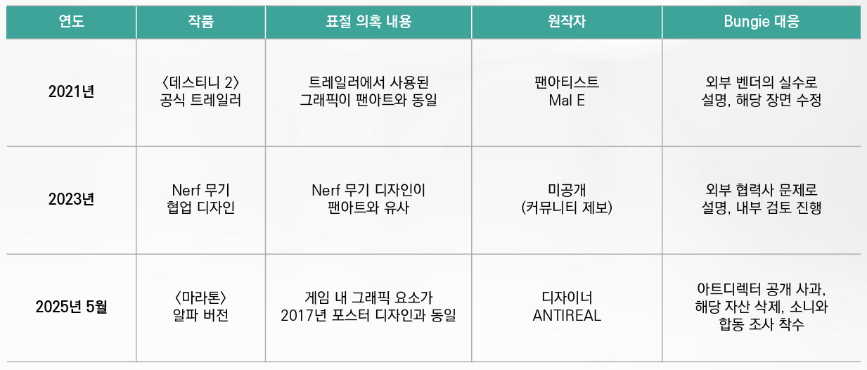 게임 개발사 번지(Bungie)는 2025년 5월 신작 <마라톤(Marathon)> 알파 버전에서 그래픽 요소가 독립 디자이너 ANTIREAL의 2017년 포스터 디자인을 무단으로 가져온 것이라는 폭로에 직면했다. ANTIREAL은 SNS를 통해 자신의 작품과 게임 내 그래픽을 비교하며 표절 의혹을 제기했고, 번지의 아트디렉터 조셉 크로스(Joseph Cross)는 “전 직원이 그래픽 디자이너의 작업을 무단으로 사용했으며, 2020년에 코드에 반영되었다”고 인정했다. 그는 품질 검수 과정의 부족을 공개적으로 사과하며, 해당 자산을 즉시 삭제하고 외부 전문가를 통한 검토를 진행하겠다고 밝혔다. 또한 소니와의 합동 조사를 통해 재발 방지 체계를 수립하겠다는 입장을 발표했다. 이 사건은 대형 개발사에서도 내부 참조 자료 관리와 외주 작업물 검증이 제대로 이루어지지 않을 수 있음을 보여주는 사례로 평가된다.