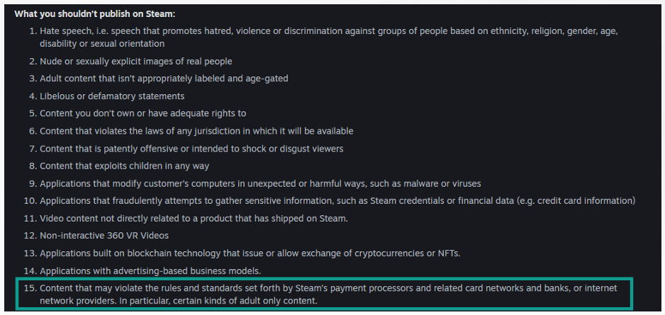 스팀은 7월 중순 개발자 대상 정책을 업데이트하여, 결제 처리업체 및 관련 카드 네트워크, 은행의 규칙과 기준을 위반할 소지가 있는 콘텐츠를 금지 항목에 추가했다. 특히 ‘특정 유형의 성인 전용 콘텐츠(certain kinds of adult only content)’를 지목하여 문제적 성인물에 대한 새로운 제재 근거를 마련한 것이다. 스팀 정책의 15번째 금지 조항으로 추가되었는데, 업데이트 직후 비윤리적 관계나 성적 폭력 등을 소재로 하는 극단적인 시뮬레이터류 게임들이 대거 삭제되었다. 이러한 불법적이고 부적절한 콘텐츠에 대한 제재는 필요한 조치였다. 다만 밸브는 결제 수단을 잃으면 플랫폼 전체가 마비될 수 있다는 현실적 우려로 부득이 해당 게임들을 삭제했으며, 영향을 받은 개발자들에게는 개정된 규정과 후속 조치를 안내했다.