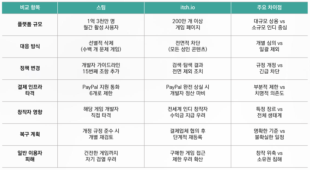 <표> 스팀 vs itch.io 성인 콘텐츠 대응 비교