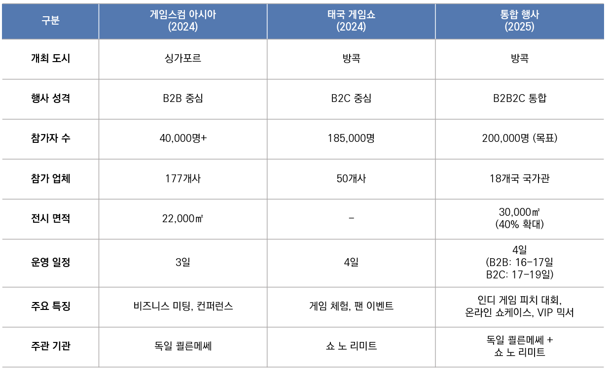 게임스컴을 운영하는 독일 쾰른메쎄와 태국의 미디어 기업 쇼 노 리미트(Show No Limit)가 협업을 통해 두 행사를 합병함으로써 비즈니스와 소비자 행사를 통합한 B2B2C 플랫폼을 탄생시켰다. 태국 게임쇼(Thailand Game Show)는 2006년부터 개최되어 태국 최대 게임쇼로 자리잡았으며, 2024년에는 185,000명의 관람객과 50개 업체가 참여하여 강력한 현지 팬 베이스를 확보했다. 두 행사의 통합은 단순한 규모 확대를 넘어 비즈니스 중심의 게임스컴 아시아와 엔터테인먼트 중심의 태국 게임쇼의 장점을 결합하여 완전한 게임산업 생태계를 구현하겠다는 의도를 담고 있다.