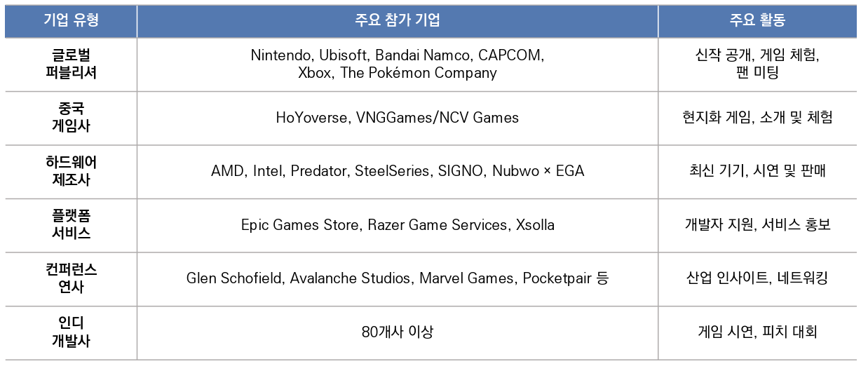 게임스컴 아시아 × 태국 게임쇼 2025에는 닌텐도(Nintendo), 유비소프트(Ubisoft), 호요버스(HoYoverse) 등 글로벌 AAA 게임사들이 대거 참여하여 동남아시아 시장에 대한 높은 관심을 입증했다. 주요 참가 기업으로는 반다이 남코 엔터테인먼트(Bandai Namco Entertainment), 캡콤(Capcom), 포켓몬컴퍼니(The Pokémon Company), Xbox 등이 엔터테인먼트 영역에서 쇼케이스를 진행한다. 특히 닌텐도는 2025년 9월 싱가포르에 자회사를 설립하고 자본금 800만 싱가포르달러를 투입하며 태국 현지 법인 설립도 검토 중이라고 밝혔다. 이는 동남아 시장 확대 전략의 일환으로, 글로벌 게임사들이 이 지역을 단순한 판매 시장이 아닌 전략적 거점으로 인식하기 시작했음을 보여준다.