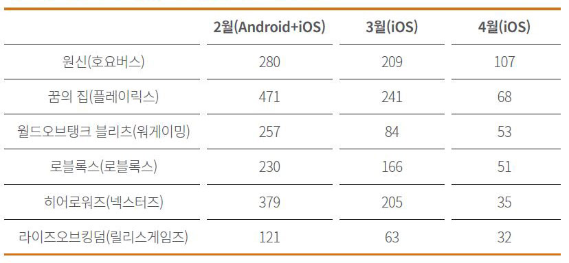 2월~4월 러시아에서 가장 많은 수익을 올린 모바일 게임 타이틀을 살펴보면, 이용자 매출이 크게 감소하고 있다. 자국 게임사가 만든 <히어로워즈(Hero Wars)>조차도 매출이 크게 감소하고 있다.