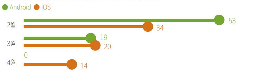 러시아의 운영체제별 모바일 게임 매출 증감 추이 (단위: 백만 달러) 출처: gameworldobserver.com(2022.04)