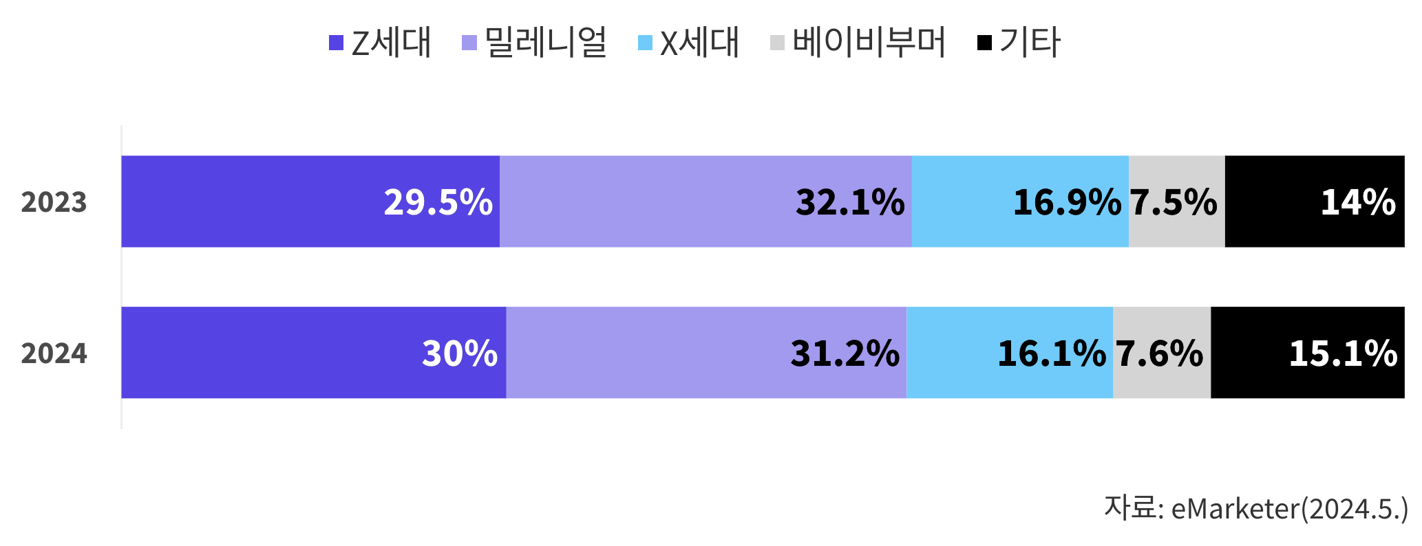 [그림 3] 미국 세대별 유튜브 시청 비율(2023~2024년) (출처: eMarketer, 2024.5.)