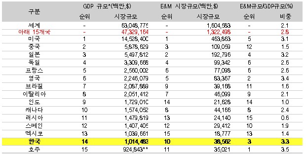 특히 GDP 규모 대비 E&M 시장 비중의 경우, 우리나라는 GDP 규모에서 1조 145억 달러로 14위(1인당 국민총소득 28위)이며, E&M 시장규모는 386억 달러로 10위를 기록했다. 그러나 국가규모(총 인구수 19위) 및 소득수준을 고려할 경우 우리나라의 경제규모(GDP 14위)와 E&M 시장규모(10위)는 크다고 할 수 있다. 즉, 우리나라는 GDP 규모 대비 E&M 시장의 비중이 세계 평균(2.1%)이나 15개 국가의 평균(2.8%)보다 높은 3.3%로 호주(3.5%), 영국(3.4%)에 이어 세계 3위에 해당한다. 이는 우리나라가 상대적으로 타 산업에 비해 E&M 시장비중이 높다고 할 수 있다.
