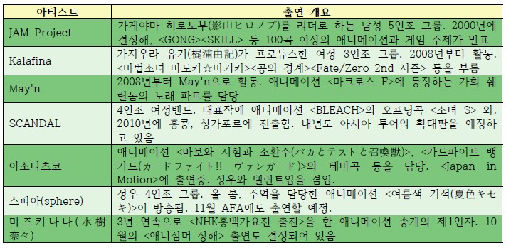 |표 2| 해외진출이 두드러지고 있는 주요 애니메이션 송 관련 가수