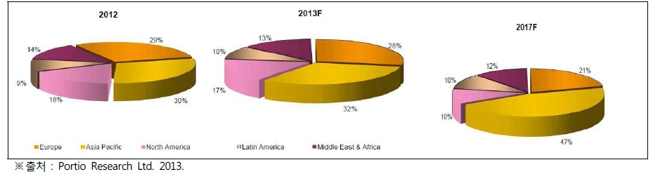 이러한 이용자 수의 권역별 비중을 살펴보면, 2012년의 경우 아시아태평양 지역이 세계 모바일 앱 이용자의 30% 차지하여 가장 높은 비중을 보였고, 그 다음으로 유럽이 29%, 북미 18%, 중동 및 아프리카 14%, 라틴아메리카 9%였다. 이후 2013년 및 2017년 전망치에서는 점차 아시아태평양 지역의 비중이 연평균 39.8%의 높은 증가율(CAGR, 2012~2017)을 보이면서 2013년에는 32%, 2017년에는 세계 모바일 앱 이용자 수의 절반에 육박하는 무려 47%를 차지할 것으로 보인다. 이에 비해 북미 및 유럽 지역의 비중은 점차 감소(CAGR 북미 17.7%, 유럽 22.4%) 하는 것으로 나타나, 앞으로 아시아 지역이 모바일 앱 시장에서 매우 중요한 위상은 점할 것으로 예상된다.