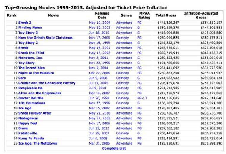 ╶ 1995년부터 2013년까지 약 9년 동안의 극장 수익 및 수익을 보았을 때, 2004년 개봉되고 PG 등급인 <슈렉 2>가 1위를 차지