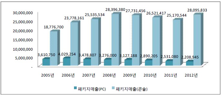 보인 적은 조사 개시 이래 처음. ╶ 패키지판매 매출은 PC게임과 콘솔게임을 합친 것으로 PC게임 패키지 판매액은 2006년을 피크로, 콘솔게임의 패키지 판매액은