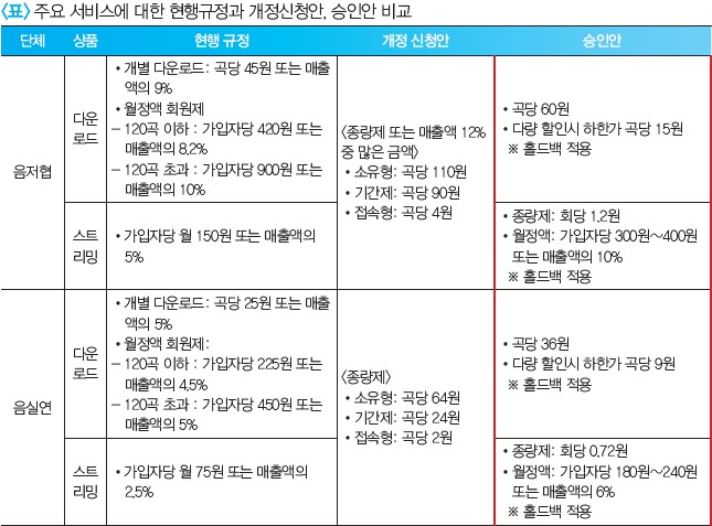 6월 8일 최종 승인 - 권리자와 유통사, 일반 소비자 등 다양한 이해관계자간에 ▲종량제 전환과 단가 인상 ▲정액제 기반에서 점진적 개선 ▲현행