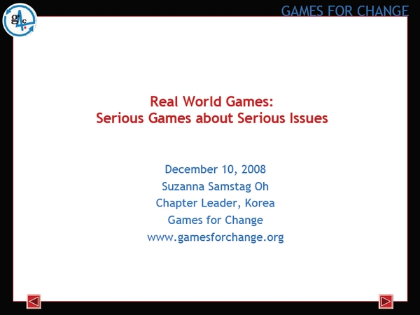 Real World Games:Serious Games about Serious Issues 발표자 : Suzanna Samstag Oh (Game 4 Change 한국지부장)