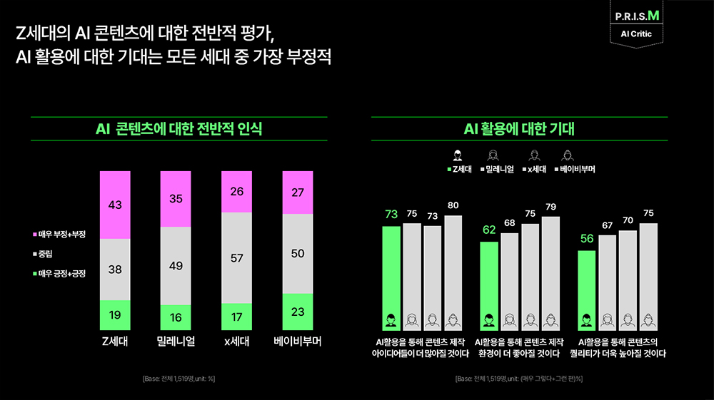 Z세대는 AI 기술에 대한 친숙도가 높고, AI가 자신들의 콘텐츠 소비 패턴에 맞는 추천을 해줄 것이라는 신뢰를 보인다. 그러나 흥미로운 점은 AI가 제작한 콘텐츠에 대해서는 가장 비판적인 세대라는 점이다. 이는 Z세대가 AI에게 인간적인 깊이와 감성을 요구하기 때문이다. Z세대는 유튜브 알고리즘이나 Chat GPT와 같은 좋은 퀄리티의 AI에 대해서는 만족감을 느끼는 한편, AI가 직접 제작한 콘텐츠는 ‘깊이가 부족하다’고 느끼는 경향이 있다.
