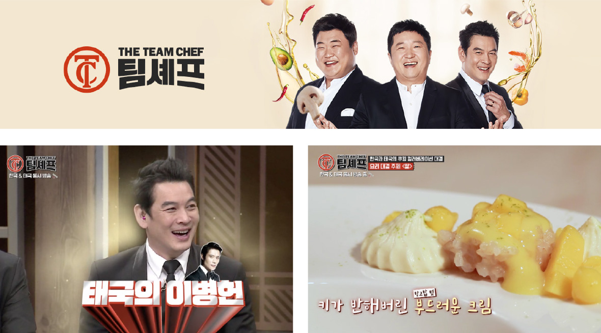 포맷 공동 개발을 넘어 합작 예능도 시도됐다. 지난 6월 30일 JTBC에서 방영을 시작한 요리 대결 프로그램 <팀셰프 (The Team Chef)>는 태국 지상파 GRAMMY GMM ONE과 한국 JTBC가 함께 제작했다. 이 프로젝트는 한국 측에서 먼저 태국 측에 제안해 세부 기획안을 함께 짰다. 한국 연예인과 태국 연예인이 함께 진행을 맡고 양쪽 요리사가 출연하는 등 제대로 된 합작 프로그램이라는 점에서 의미 있다. <팀셰프> 성희성 PD는 “다양한 소재를 활용해 프로그램을 새롭게 만들고 싶다는 바람이 있었는데 해외 제작사에서 한국 콘텐츠에 관심을 가지면서 새로운 시도가 가능해졌다. 기획부터 방영까지 전 과정을 공조한다는 점에서 의미가 있다”고 말했다.
