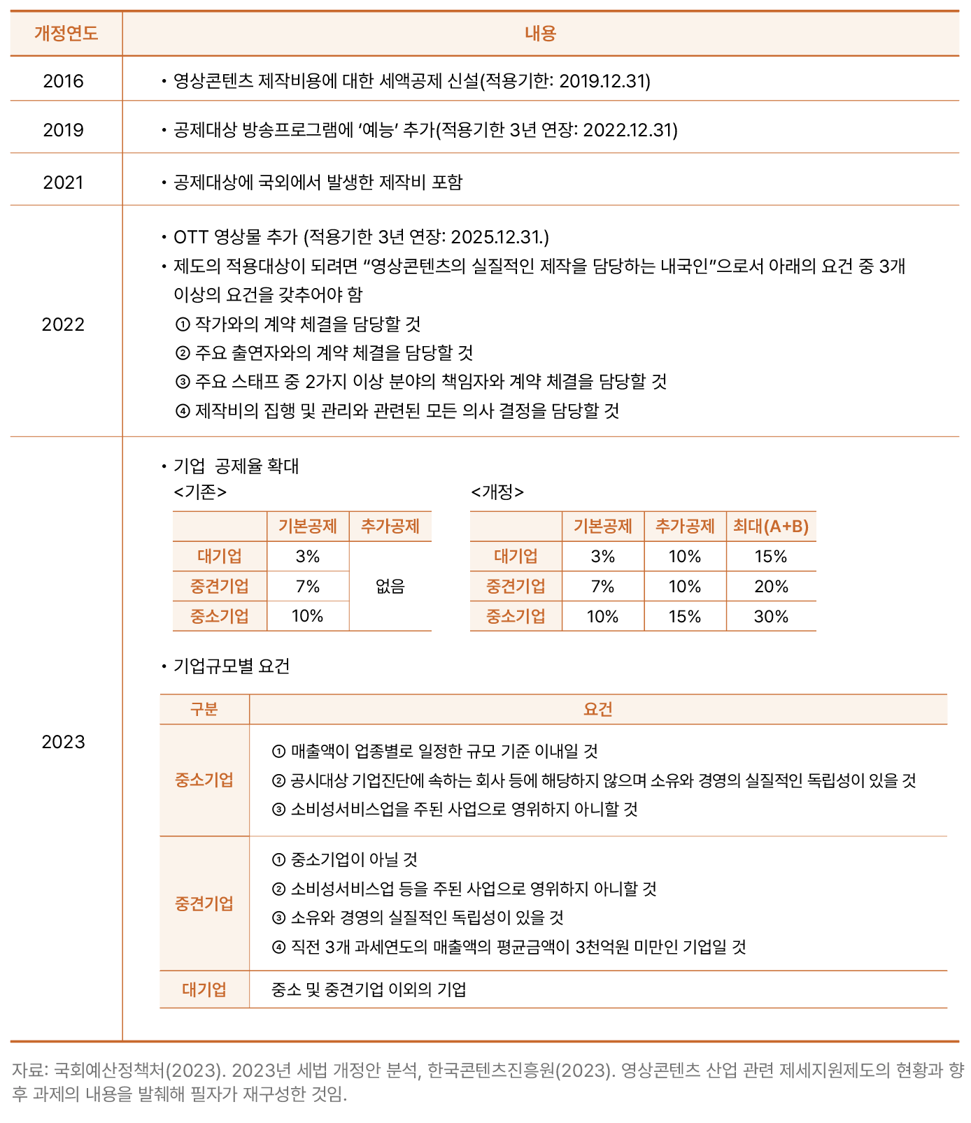 영상콘텐츠 제작비용에 대한 세액공제 조항은 지금까지 크고 작은 개정을 포함해 모두 다섯 차례에 걸쳐 이뤄졌다(개정 시점 2019. 12. 31., 2020. 12. 29., 2021. 12. 28., 2022. 12. 31., 2023. 12. 31.). 개정연혁을 살펴보면, 최초 제도 도입 당시 지원방안은 기업 규모에 따라 3~10%의 공제율을 차등 적용하고, 일몰 기한은 3년으로 설정했다. 하지만 제도 유지의 필요성이 강조되며, 2019년 12월 31일 영상콘텐츠 산업 지원을 위하여 일몰 예정이었던 세액공제 제도의 일몰 기한은 다시 3년 연장(2019년 12월 31일 → 2022년 12월 31일)되었다. 이후 2021년 12월 31일 세액공제 대상을 영상콘텐츠 제작을 위하여 국내에서 발생한 비용에서 국내외에서 발생한 비용으로 확대 개편함으로써 적용대상의 범위를 확대하였다. 2022년 12월 31일 일몰 예정이었던 제도는 또 한번 일몰 기한이 3년 연장(2022년 12월 31일 → 2025년 12월31일)되었고, 적용대상에 온라인 동영상서비스(OTT)를 통해 제공된 비디오물을 추가하였다.