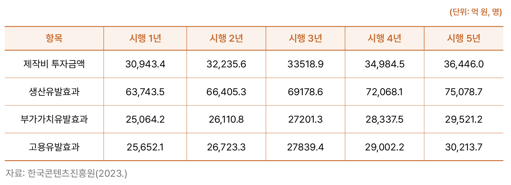 한국콘텐츠진흥원이 발간한 영상콘텐츠 창작 세제지원 실효성 제고방안 연구(2023) 보고서에 따르면, 경제적 파급효과는 제작비투자금액, 생산유발효과, 부가가치유발효과, 고용유발효과 등 모든 면에서 시행 시기가 늘어나는 것과 비례해 늘어나는 것으로 나타났다. 그리고 그 규모는 우리가 예상한 세수 감소분을 월등히 뛰어넘는 결과임을 보여주고 있다. 다음 [표 2]는 연구진이 각 경제적 파급효과를 시행 시기별로 예측해 정리한 것이다.